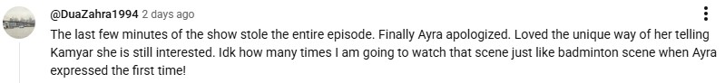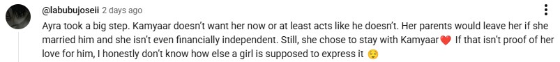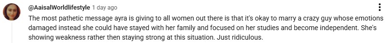 Questioning Ayra’s decision to marry Kamyar, a viewer stated that she should have focused on her studies, family and becoming independent instead. They posted:
