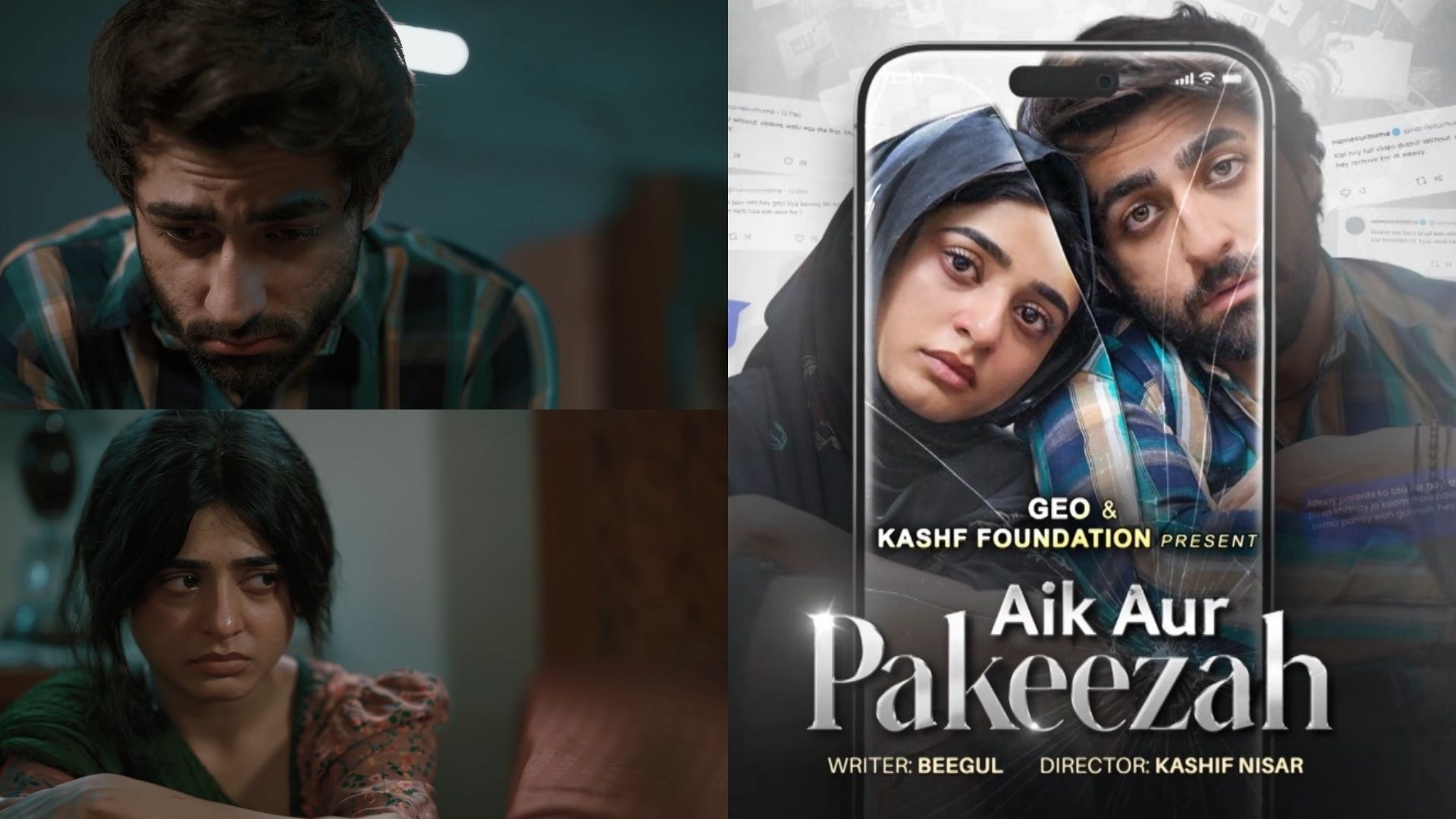 The highly anticipated Aik Aur Pakeezah has now taken the screens, with an impactful story of love through the lens of a cybercrime case. A Geo and Kashaf Foundation production, the drama serial is written by Bee Gul and directed by Kashif Nisar. Pakeezah(Sehar Khan) and Faraz(Nameer Khan) found themselves in the middle of a scandal when they were caught together in a hotel room by some goons.