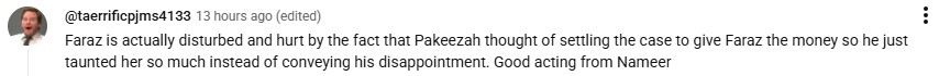 Shocked by the conversation, a user stated that Faraz attempts to push Pakeezah further into her quest for justice. They posted: