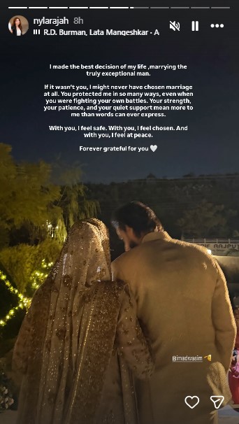 Imad took to Instagram to announce his marriage, stating that Nyla has brought calm, dignity, and strength into his life. He added that his past marriage had been the most difficult time of his life, and Nyla had been subjected to judgment due to that. He further said that he wants to remain in the lives of the children he shares with Sannia and offer love and guidance. In the hope of understanding and peace, he posted: