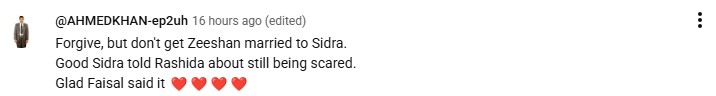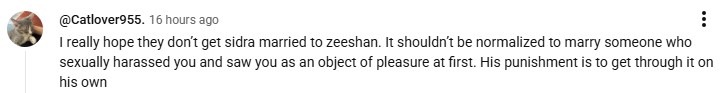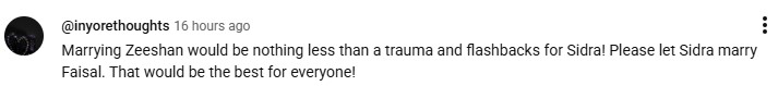 Some stated that on a happier note, Sidra can forgive Zeeshan, but hoping for a marriage is wrong on all ends. A user posted: