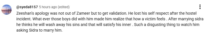 Another stated that Zeeshan’s apology is a selfish attempt to wash away his sins and satisfy himself. Expressing disgust over the thought of Zeeshan marrying Sidra, a user commented: