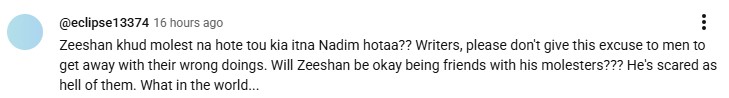 Netizens also argued that by offering an apology to Zeeshan would mean the writers are making excuses for such men. A viewer stated: