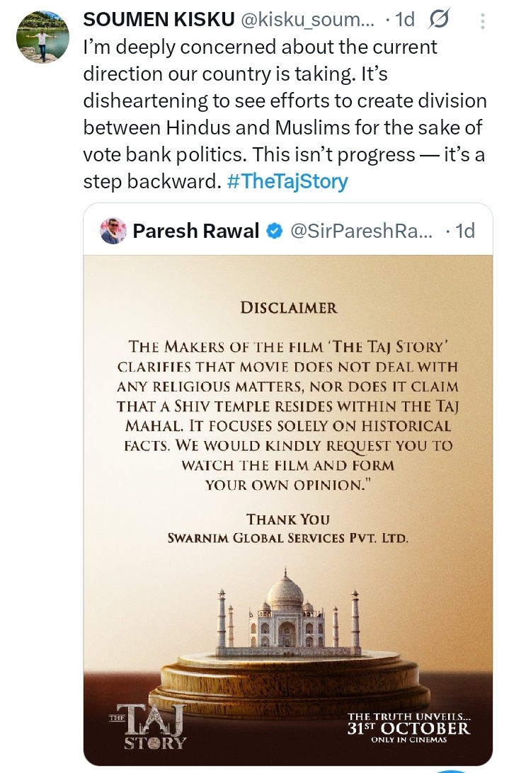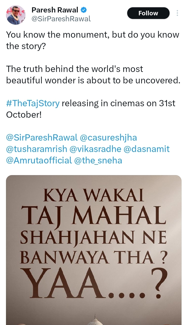 In a deperate attempt to save-face and tout the hindutva extremist propaganda, Bollywood has launched the movie ‘The Taj Story’ starring the senior actor Paresh Rawal, infamous for his ignorant views laced with Hindutva bigotry. This courtroom drama will hit the cinema screens on 31st October.