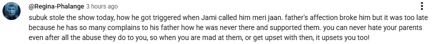 Happy with how emotional blackmail failed with Subok, Kafeel’s invested audience was touched by the father-son exchange. Giving a hat off to Subok for giving Jami a reality check, a user commented: