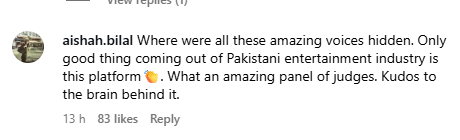 A user wrote: “Where were all these amazing voices hidden. Only good thing coming out of Pakistani entertainment industry is this platform👏. What an amazing panel of judges. Kudos to the brain behind it.”