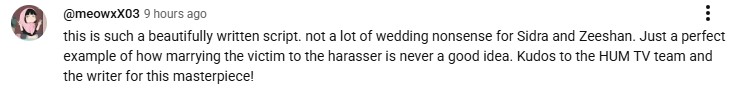 Another user appreciated how the story served justice to Sidra, giving out a clear message that marrying the survivor to the harasser is not acceptable. They posted;