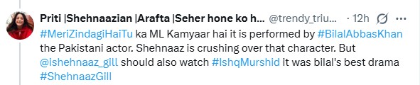 The fan also added that Shehnaaz should also watch Bilal Abbas Khan’s Ishq Murshid, another hit drama serial.
