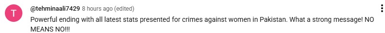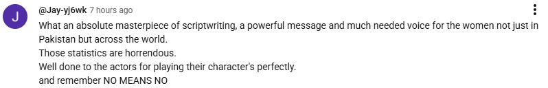 The drama serial shows that “no means no” and that it must be respected in all circumstances. The drama serial dived into reality, as Shahzaib Khanzada displayed real-life statistics regarding gender-based violence. He pushed on the fact that many rape cases are not reported due to victim blaming. He further added that rape is a heinous crime and a woman must be supported when she reports it. He also stated that, regardless of Pakistan having courts and law, the cases of gender based violence are in a prolonged backlog.