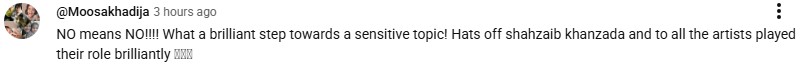 Writer and producer Shahzaib Khanzada won acclaim for creating a drama serial with important messaging, backed by facts and reality. Appreciating his effort for creating awareness, a netizen said: