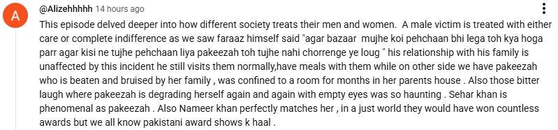 The highly engaged audience quickly grasped the messaging behind the heavy scenes, sparking online discourse. The Aik Aur Pakeezah team served the purpose, as people started talking about how women are more abused than men in the name of honour. Dissecting the bone-chilling conversation between Pakeezah and Faraz, a netizen said: