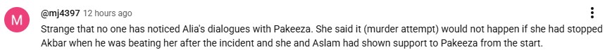 Aliya adds that things would not have come to this if they had shown support for Pakeezah; Akbar was stopped from beating his sister, a case was filed against Yaseen (Ali Jan), and she was not wed in the dark to Faraz (Nameer Khan). The inability to stop Akbar right in the moment gave him the courage to attempt murder and further regret the missed shot.