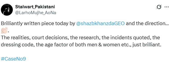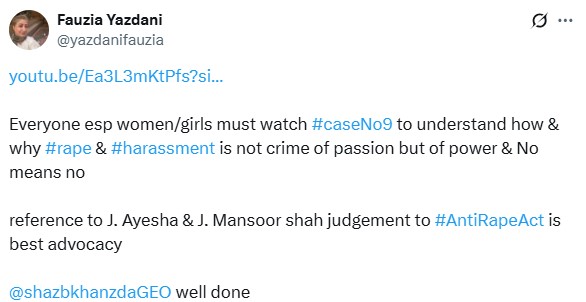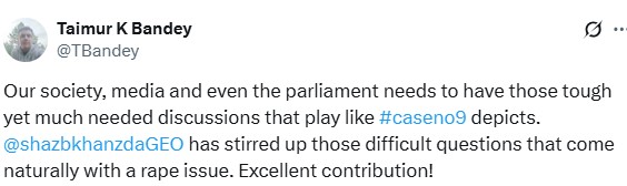 Viewers are in awe of the script and structured approach towards rape cases and their sensitivity. Citing real-life case judgments ensures the audience understands the law and the processes involved in any rape case. They appreciate the writer, Shahzaib Khanzada, for revealing the reality of a court hearing. A user wrote on X: